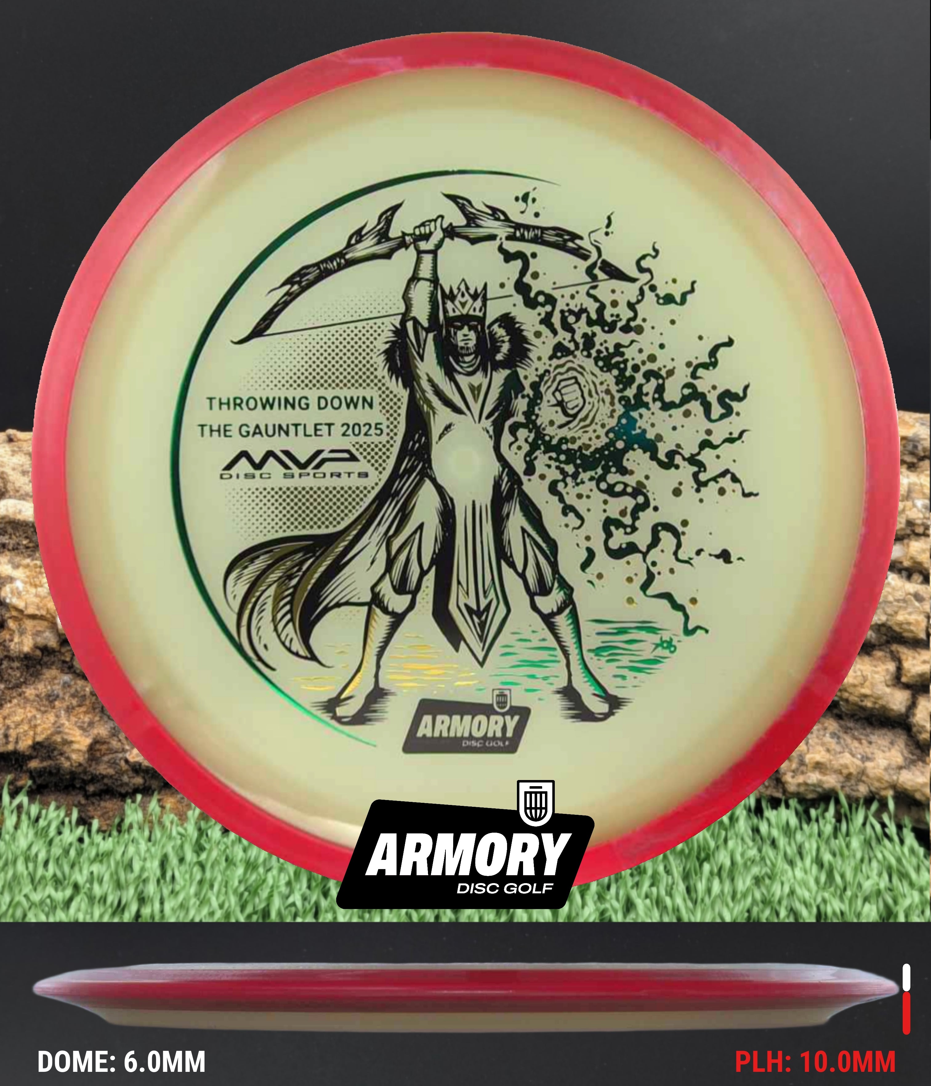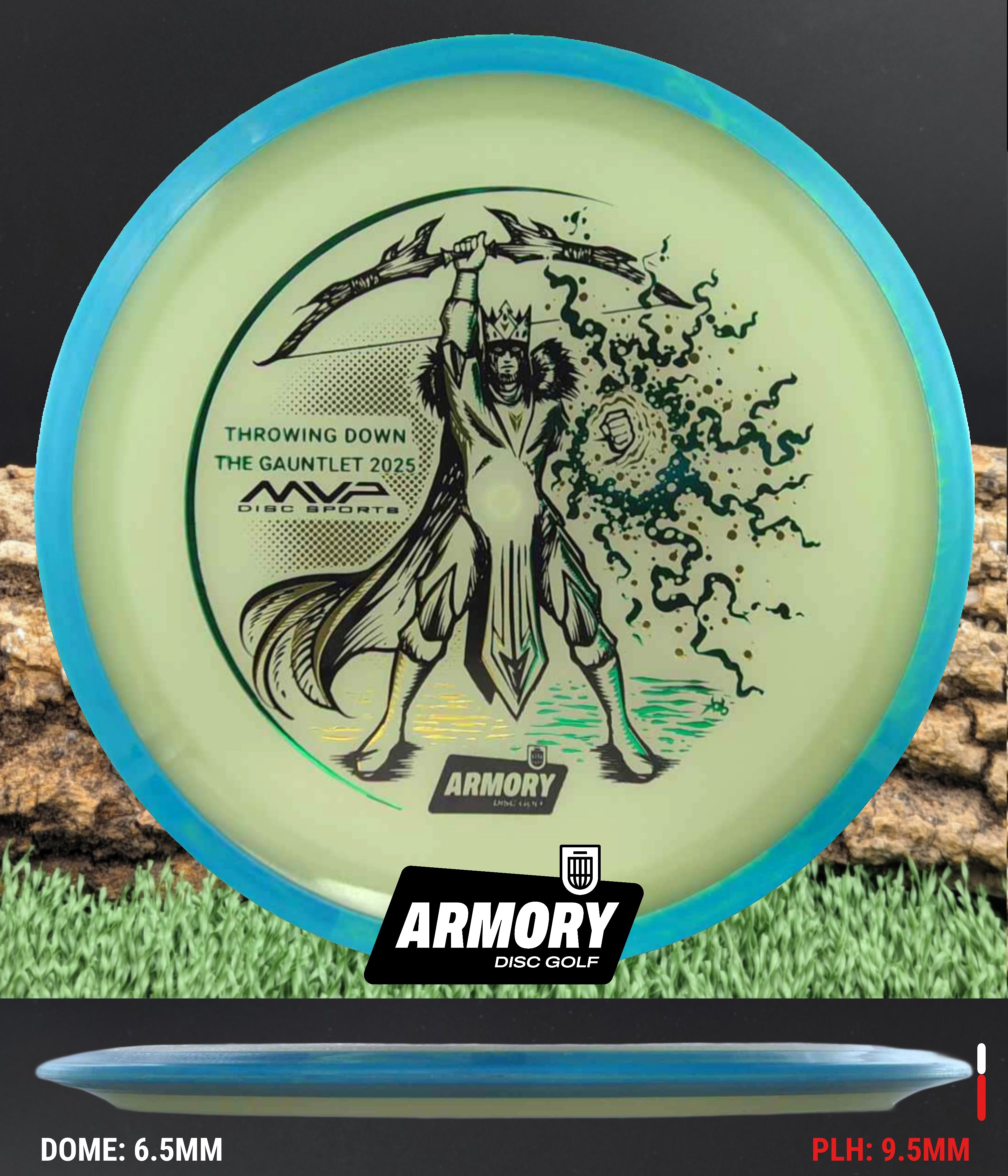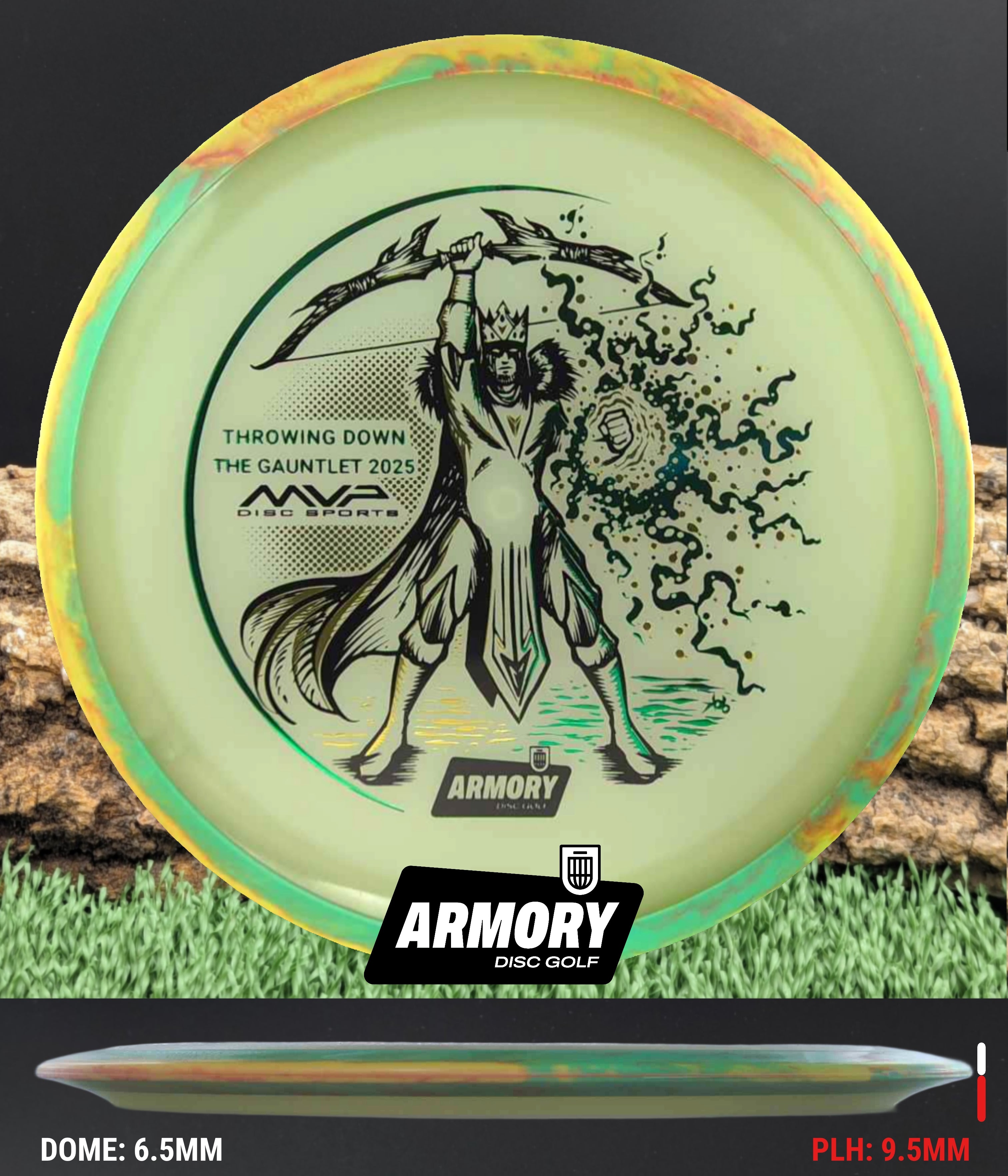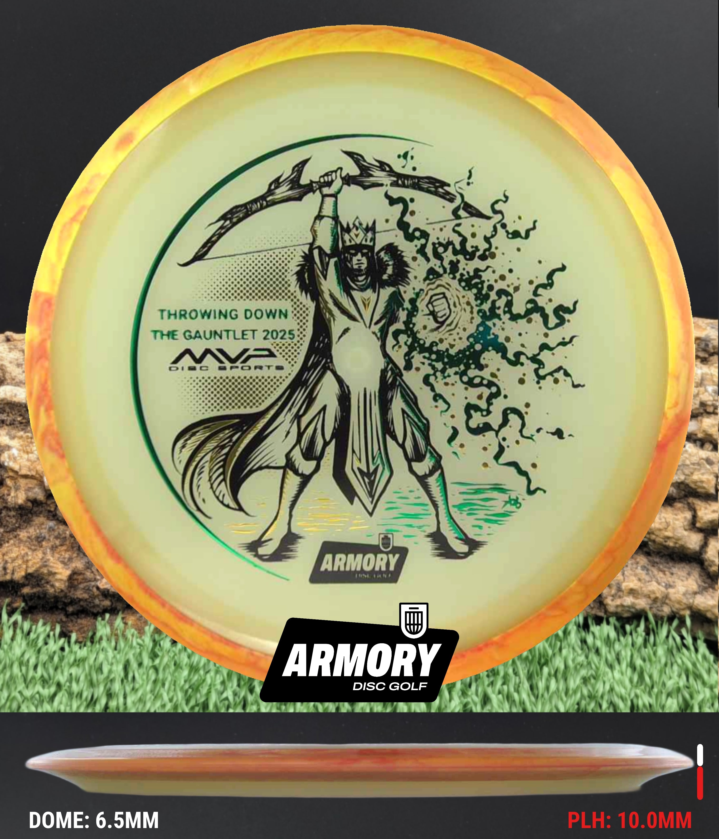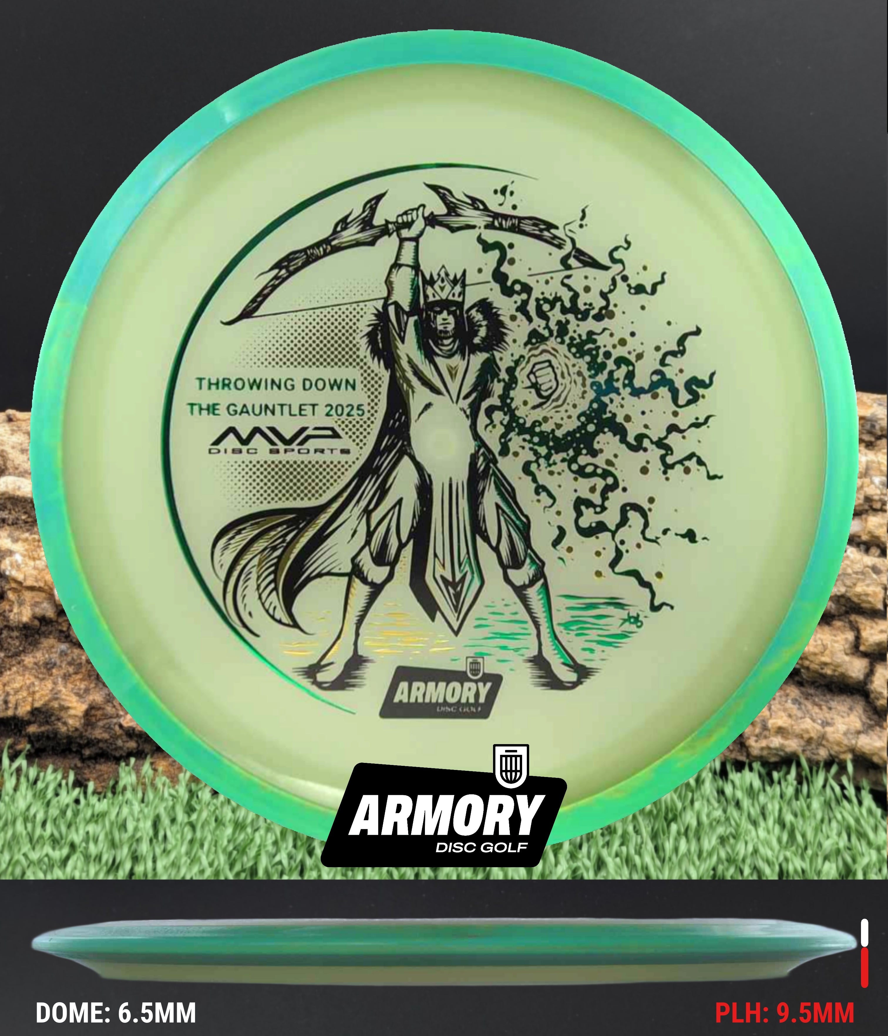 Flat, stable, and glowing with victory — the Eclipse Insanity steps into the spotlight for the Throwing Down the Gauntlet Championship. Featuring a 3-foil black, gold, and emerald stamp from Kelly “KoB” Baber, this run depicts the crowned Woodland Syndicate general standing victorious with bow raised high — a perfect tribute to calculated power and precision.